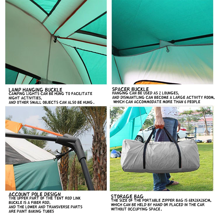 Lamp hanging buckle Camping lights can be hung to facilitate night activities, and other small objects can also be hung Spacer buckle Hanging can be used as 2 lounges, and dismantling can become a large activity room, which can accommodate more than 6 people Account pole design The upper part of the tent rod link buckle is a fiber rod, and the lower and transverse parts are paint baking tubes Storage bag The size of the portable zipper bag is 68x26x26cm, which can be held by hand or placed in the car without occupying space.